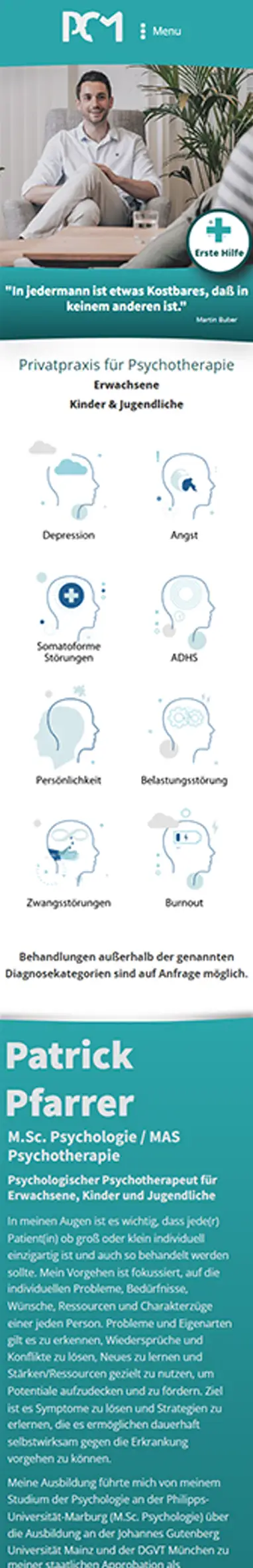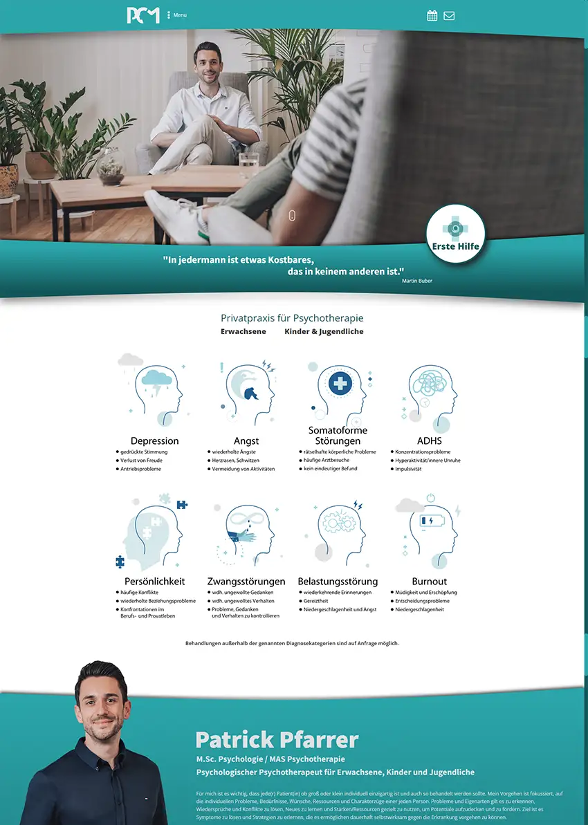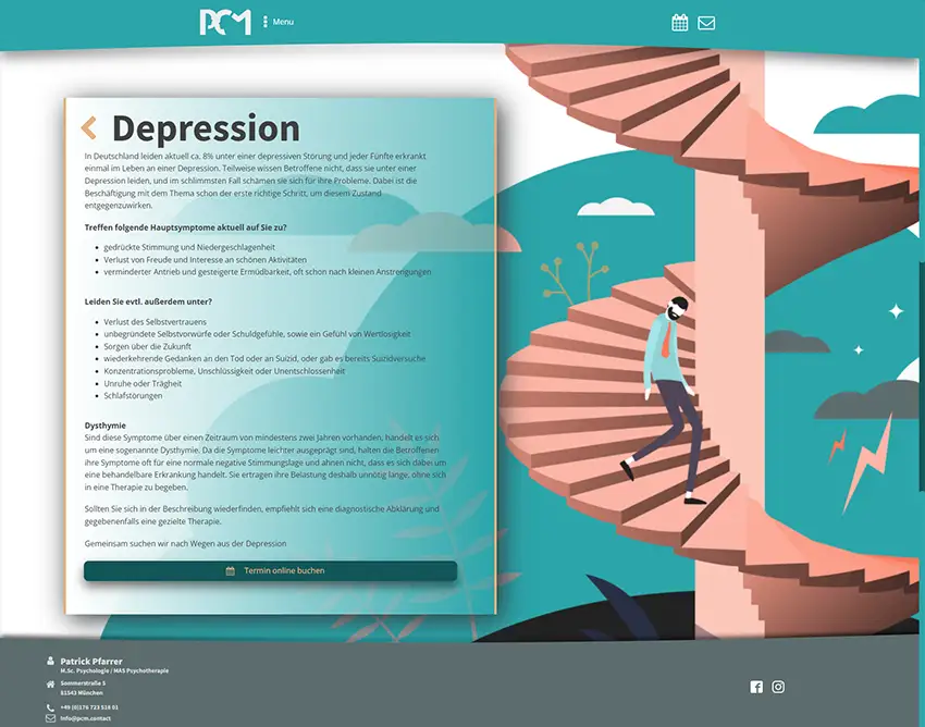 PCM ist eine psychotherapeutische Praxis mit Sitz in München. Hier konnte ich meine Expertise als Illustratorin und Grafikerin bei der Erstellung von animierten Lottiefiles und Diagnosen einbringen. Die technische Umsetzung wurde durchgeführt von www.ThomasSchumacher.de.